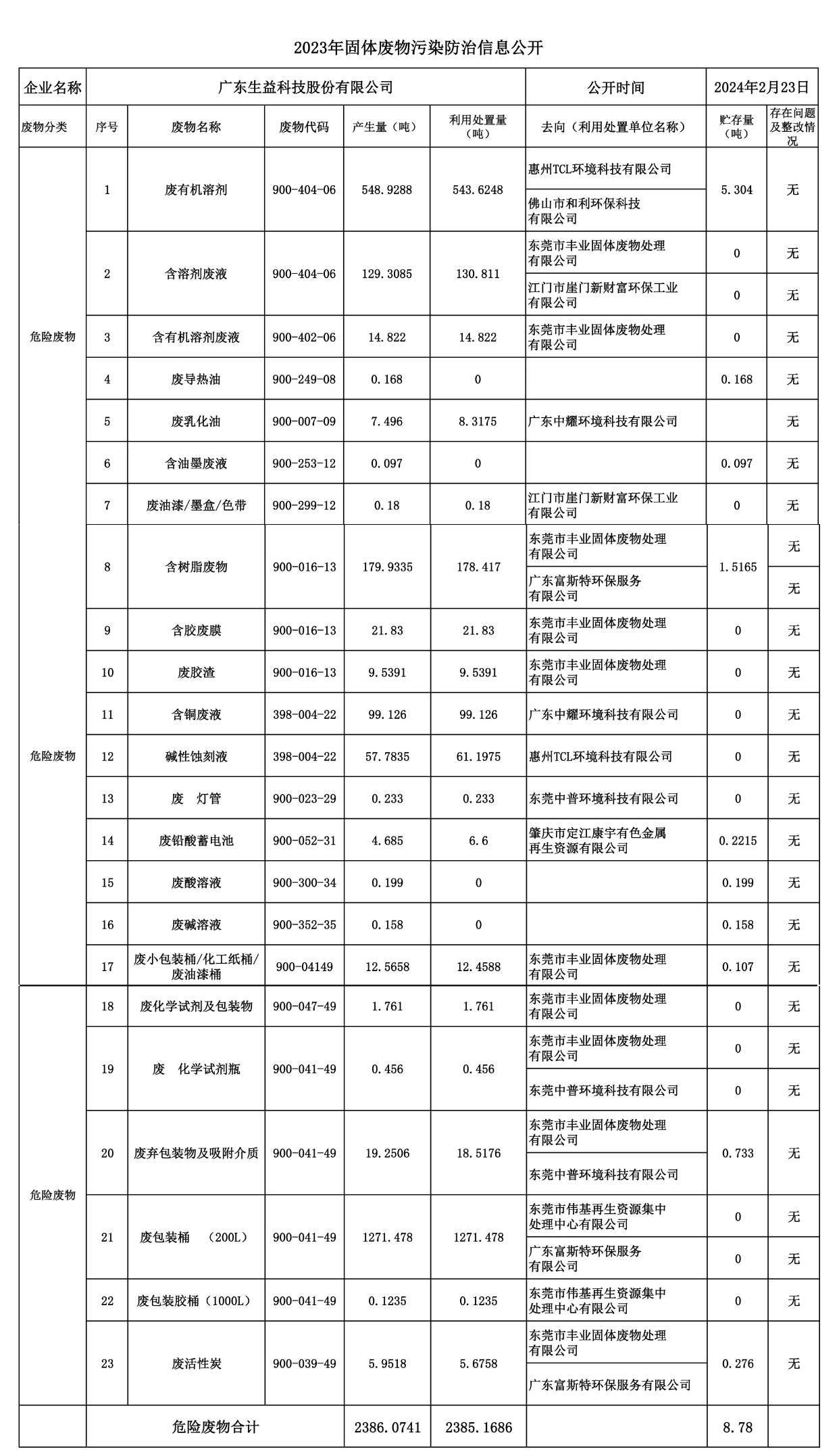 广东龙8中国官网唯一入口科技股份有限公司2023年危险废物污染防治责任信息公开