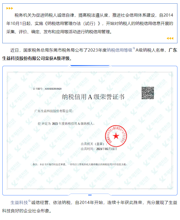 广东龙8中国官网唯一入口科技荣获2023年度“纳税信用等级A级”评级